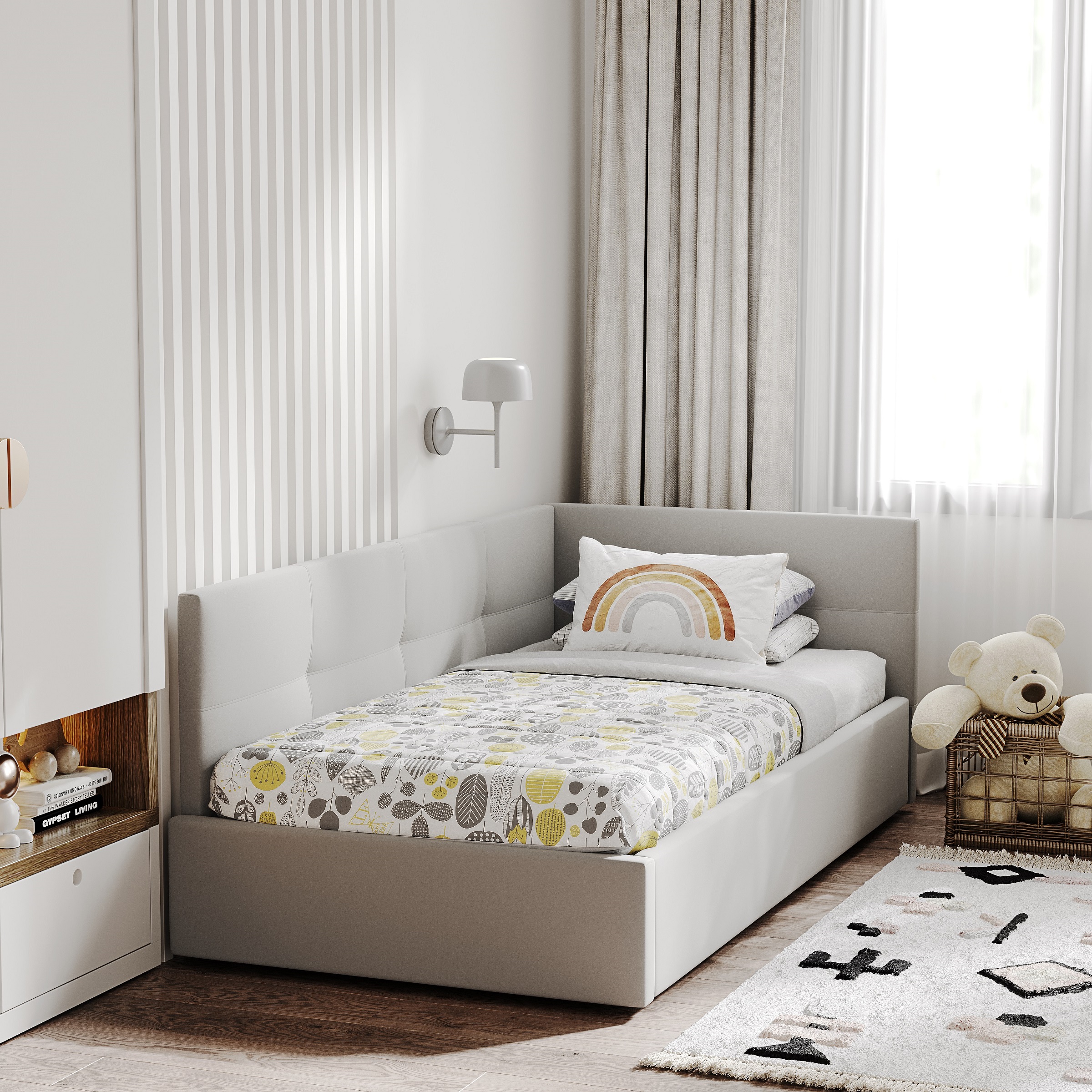Односпальная кровать с мягким изголовьем создаст в комнате стильную и уютную обстановку, не занимая лишнего места. 1-спальная кровать имеет удобный подъемный механизм с вместительным местом для хранения пастельного белья или других вещей. Кровать-тахта с надежной ортопедической решеткой выдерживает вес до 120 кг, что делает ее универсальной для сна ребенка или взрослого человека. Кровать с высоким изголовьем и мягкой обивкой в современном дизайне впишется в любой интерьер комнаты, добавляя ей стиля и комфорта.