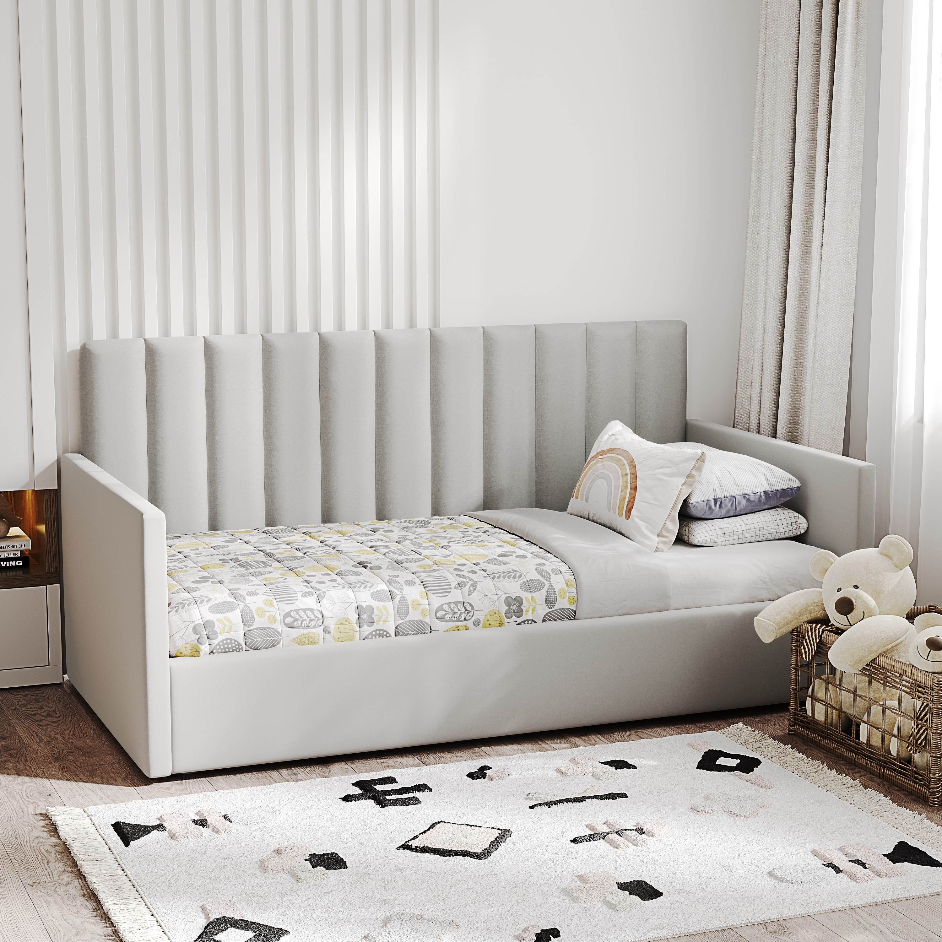 1-спальная кровать имеет удобный подъемный механизм с вместительным местом для хранения пастельного белья или других вещей. Кровать-тахта с надежной ортопедической решеткой выдерживает вес до 120 кг, что делает ее универсальной для сна ребенка или взрослого человека. Кровать с высоким изголовьем и мягкой обивкой в современном дизайне впишется в любой интерьер комнаты, добавляя ей стиля и комфорта.